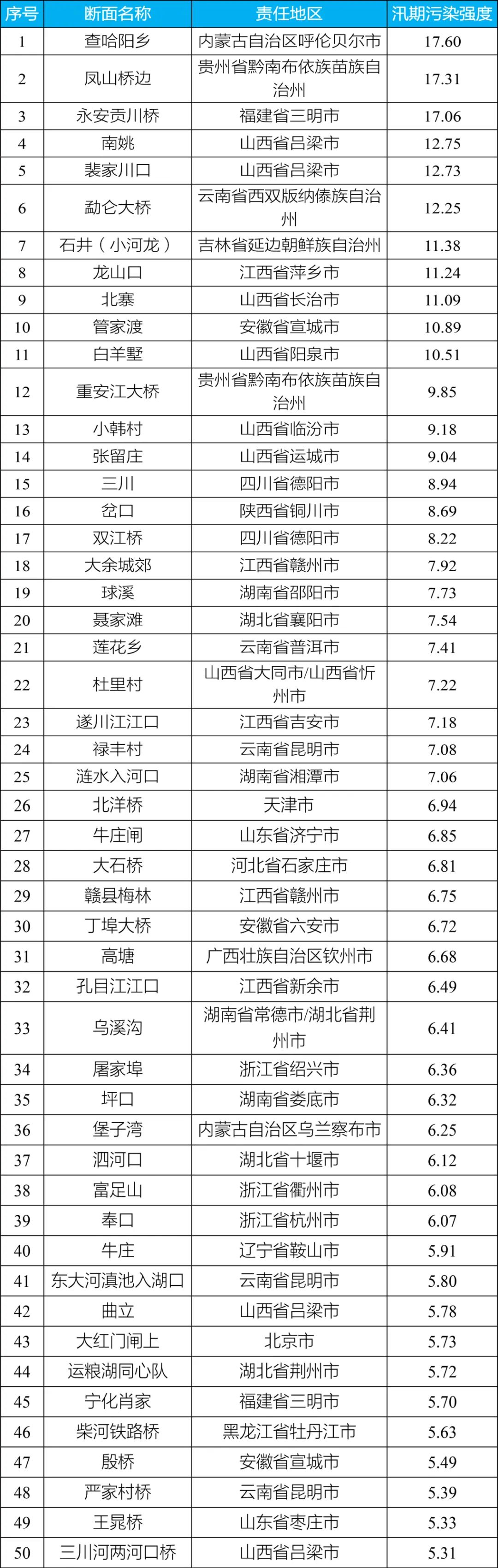 全國汛期污染強度較大的前50名斷面分布在20個省份(見附件3),數(shù)量較多省份為山西(9個)、江西(5個)、云南(5個)。其中,內(nèi)蒙古自治區(qū)呼倫貝爾市查哈陽鄉(xiāng)斷面、貴州省黔南布依族苗族自治州鳳山橋邊斷面、福建省三明市永安貢川橋斷面汛期污染強度位于全國前三名,分別達(dá)到考核目標(biāo)限值的17.6倍、17.3倍、17.1倍。